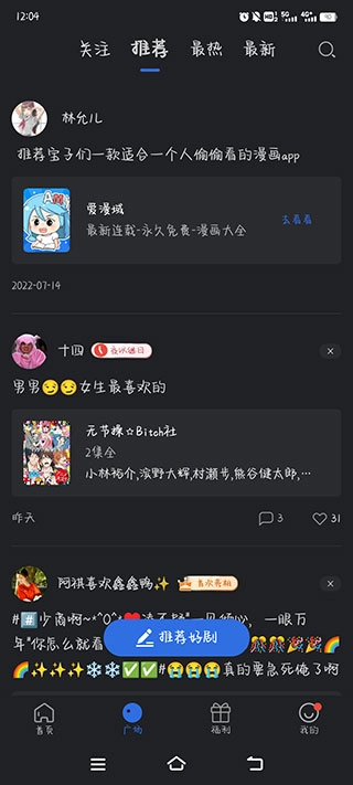 3、进入“广场”板块,能看到其他星夜影视用户推荐的优质剧集,也可以与关注的好友互动交流,进行点赞和评论操作。