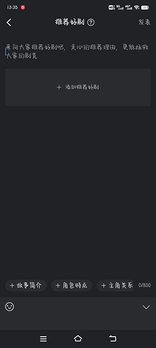 4、要是你也想发布自己的作品,可以点击底部的“推荐好剧”,进入编辑页面。这里有故事简介、角色特点、主角关系等选项,能帮你更好地梳理思路,写出优质影评,收获点赞与支持。
