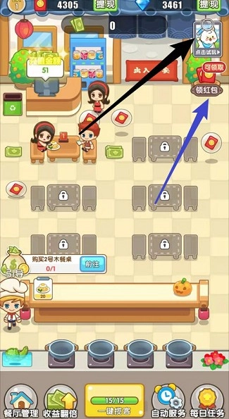 1、简单易操作的玩法机制,让你能自由打造专属餐厅,一步步积累财富,最终走向人生的高光时刻。
