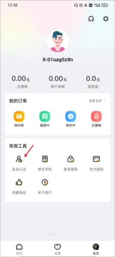 1、启动飞鸟租号应用,进入【我的】界面,找到常用工具板块并点击其中的“实名认证”选项。