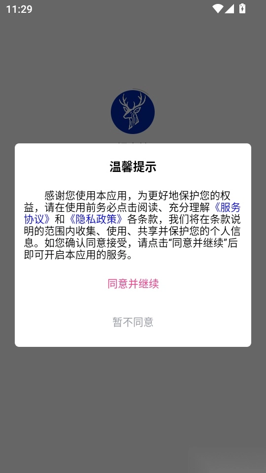 首先打开软件,阅读完“温馨提示”后,点击“同意并继续”按钮进入