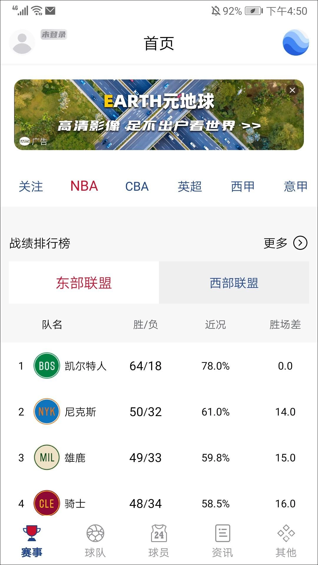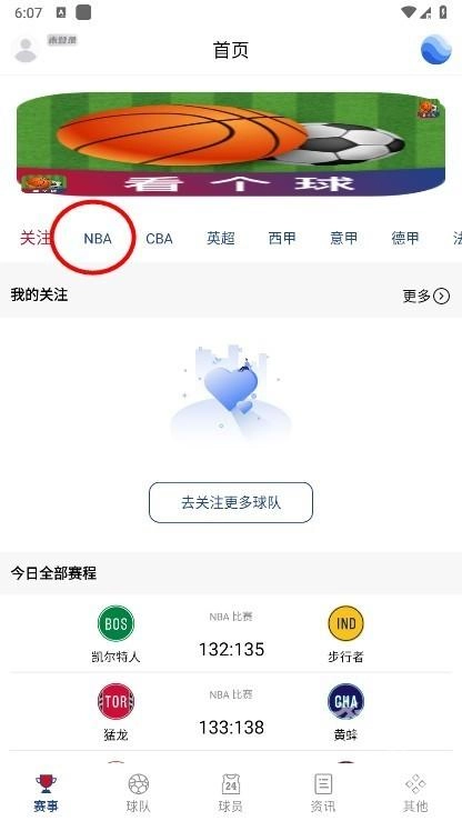 1、启动软件后,进入赛事界面,这里涵盖NBA、CBA、英超、西甲、意甲等各类赛事,下面以NBA凯尔特人队为例进行说明。