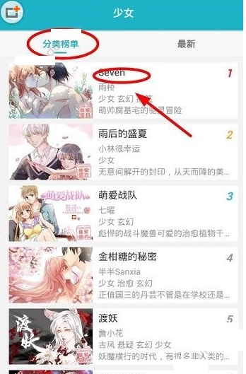 点击“少女”分类榜单,即可查看当下最热门的少女漫画内容,挑选出自己喜欢的漫画后点击进入,比如:seven;