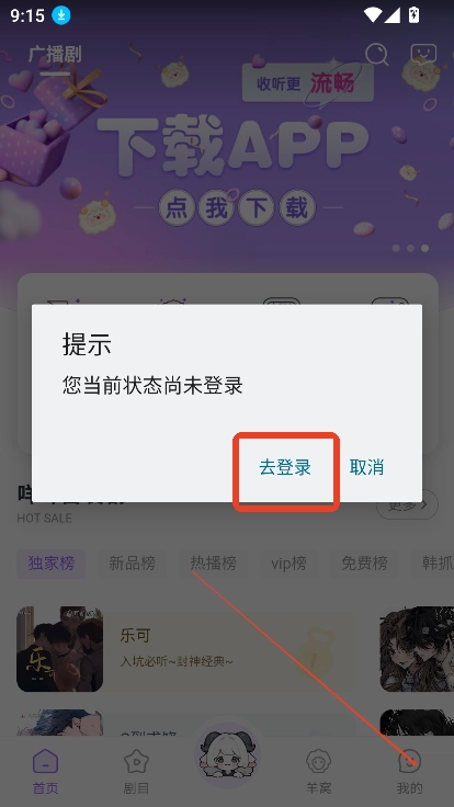 2、成功进入首页后,我们能看到丰富的独家榜、热播榜广播剧资源。