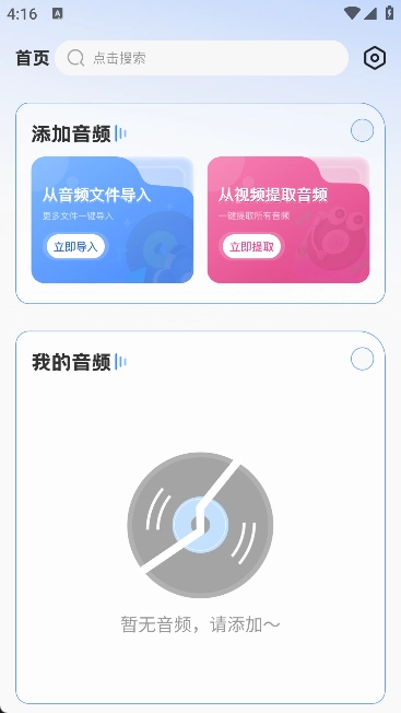 3. 进入“音频提取”界面后,可导入相应的视频片段,软件会自动完成音频提取操作。