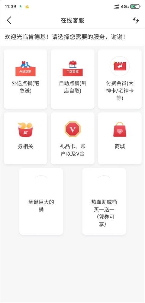 3、您也可以点击在线客服选项,然后选择其中的外送点餐功能。