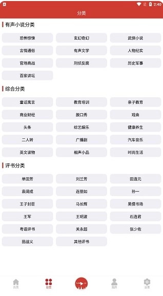 2.分类浏览:点击底部的“分类”选项,即可看到“有声小说分类”“综合分类”“评书分类”等选项,用户可依据自身喜好与需求进行选择。