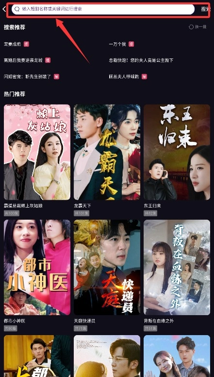 2、浏览首页分类展示的各类短剧资源,轻点顶部搜索栏即可进入短剧查询页面。