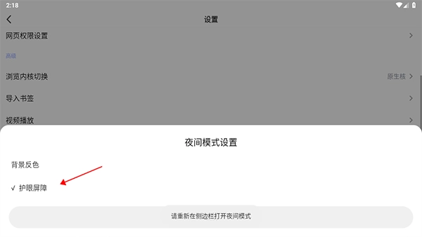 3、我们需要在设置里找到夜间模式设置并点击,然后点击右侧的背景反色功能。