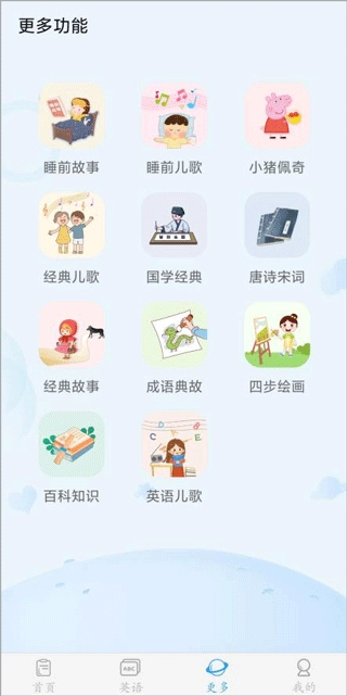 4、在更多板块里,我们为大家准备了丰富多样的小故事、儿歌和百科知识,只需点击就能查看具体内容。