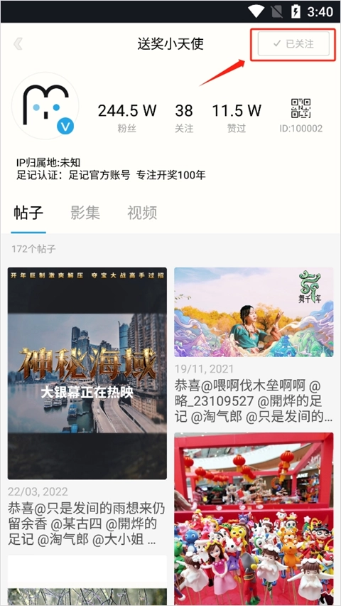 3、当然你也可以在足记上结识朋友,在广场页面发现精彩的图片和用户,还能点击头像旁边的“关注”或“+”按钮来关注对方。