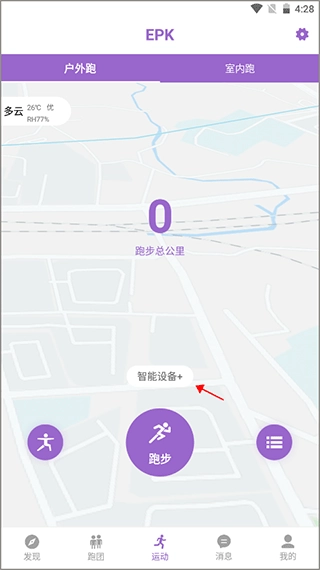 1、连接前请先开启蓝牙,随后切换至软件的“运动”板块,点击上方的“智能设备+”按钮。