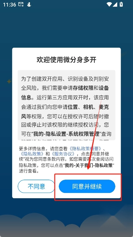 1、首先在魔趣网下载分身多开应用,接着点击“同意并继续”进入软件