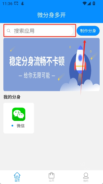 2、进入首页后,在搜索框中输入你想要多开的应用名称,接着点击“制作分身”按钮。