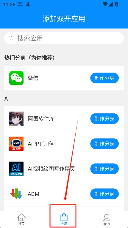 3、你也可以直接打开“应用”,从中挑选想要制作分身的应用。
