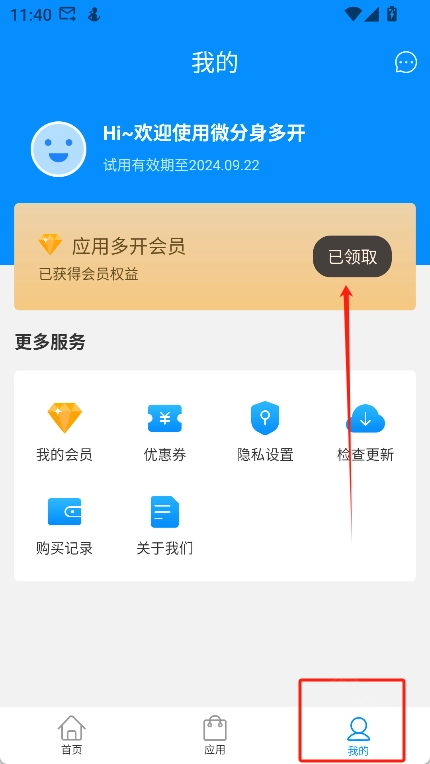 5、点击“我的”,新用户首次使用还能领取10天的应用多开会员呢