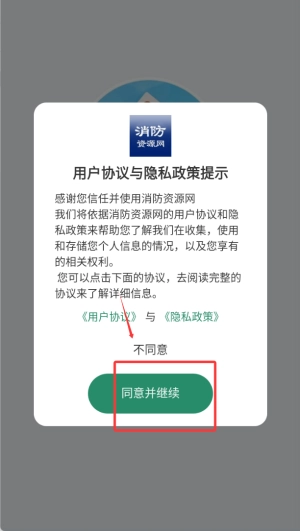 1、轻点同意选项,就能马上开启应用使用流程,快速进入消防知识的学习空间,为之后深入掌握消防规范等内容打下良好基础。