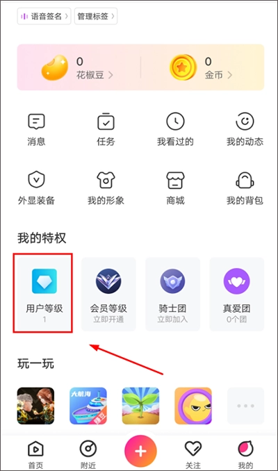 [用户] -切换为[我的] - [用户特权] - [用户等级]