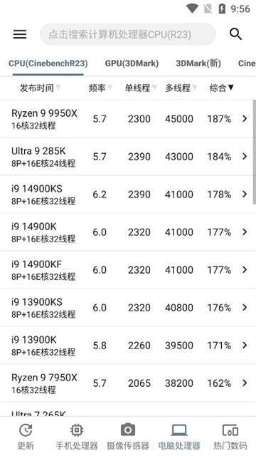 查看市面上主流处理器的性能得分。