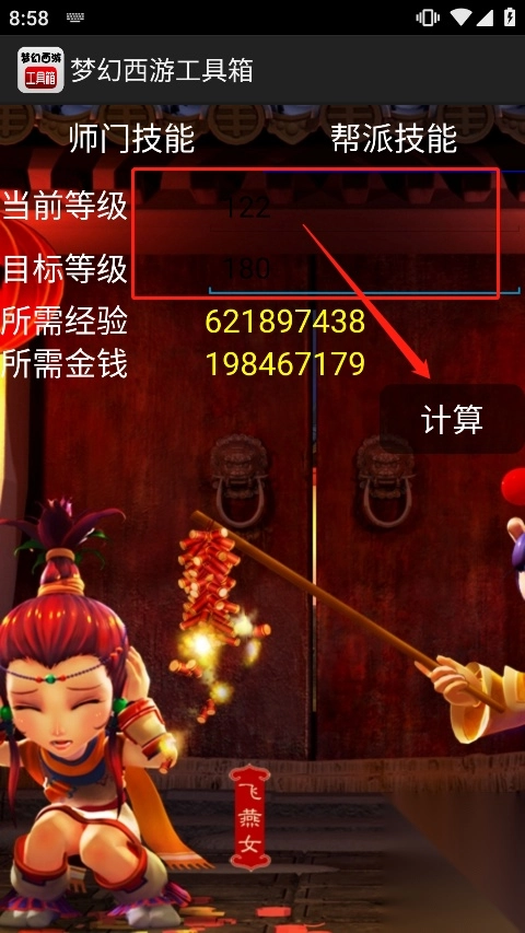 3、技能计算的使用方法和上述角色等级升级计算器一致,只需在输入栏填写当前等级和目标等级并提交计算,就能一键获取所需的经验与金钱。下图展示的是帮派技能的演示效果,师门技能的操作方式也与此相同。