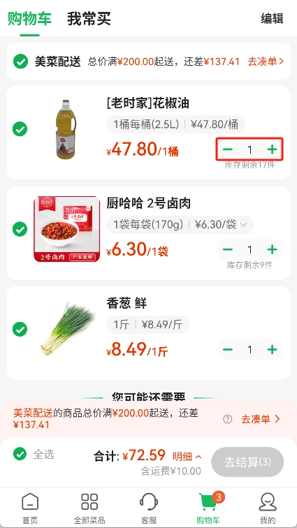 3、查看购物车:在购物车页面,您能够查看已选商品的总价并进行结算,还可以修改商品数量或删除商品。