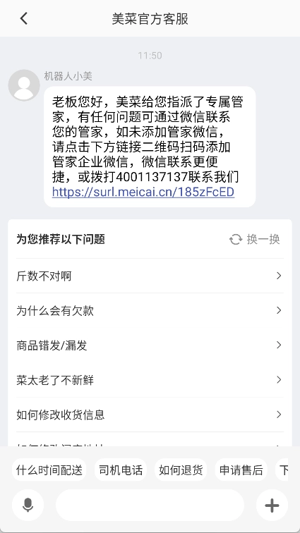 6、客户服务:若您在使用过程中碰到任何问题,可拨打美菜商城的客服服务中心咨询求助。