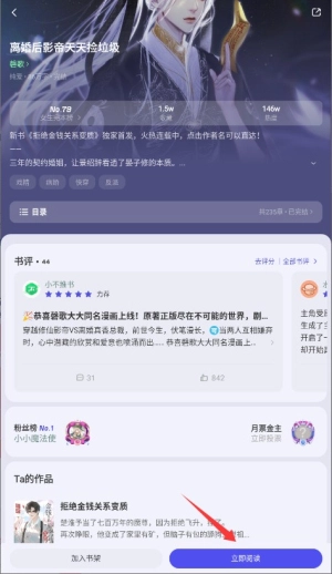 4、进入详情页后,点击“立即阅读”按钮,就能开始浏览小说正文内容了。
