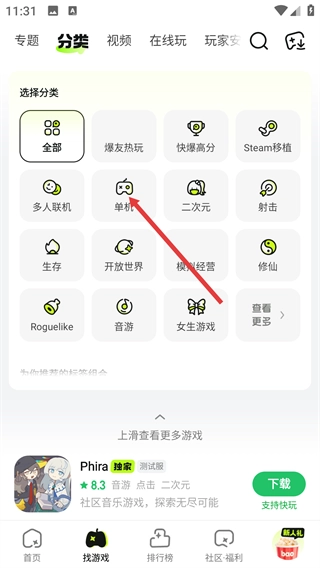 2、在分类页面点击【单机】标签,进入单机游戏列表,浏览相关内容。