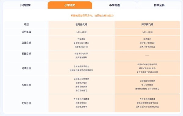 猿辅导先依据孩子的不同情况进行分类,开设了两个班级:读写强化班和博学腾飞班。这两个班级均面向小学一年级至六年级的学生。读写强化班的核心目标是巩固基础,助力孩子构建读写知识框架并梳理语文知识点;博学腾飞班的核心目标则是培育能力,帮助孩子提升语文知识综合运用能力,同时培养文化审美素养。两个班级的定位各有侧重。