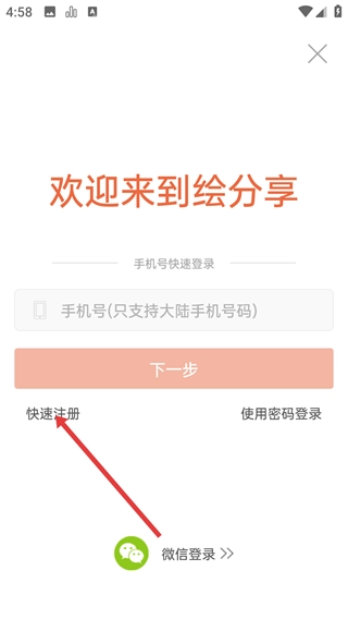 3、在【绘分享】登录页面,选择【快速注册】选项,输入大陆手机号码后点击【下一步】,即可继续推进注册流程;此外,也可以选择通过微信进行登录。