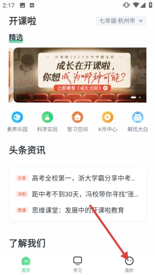 1、找到“开课啦”并打开,在首页底部找到【我的】按钮并点击,即可进入个人中心页面。