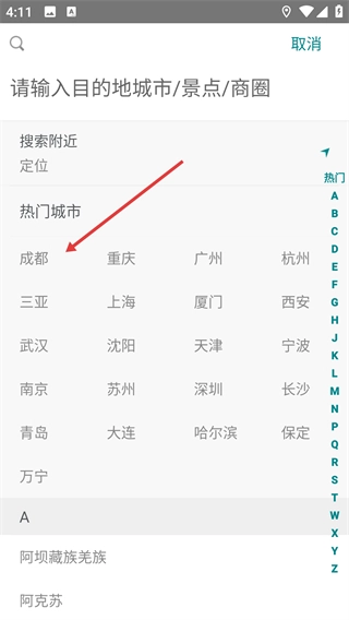 1、进入探索页面后,点击顶部的搜索框,就能进入目的地搜索界面。该界面不仅支持搜索城市、景点等内容,还可以直接选择热门城市的入口。