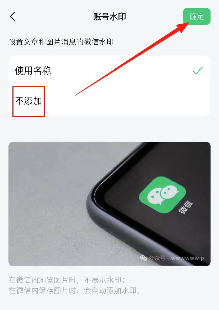 4、选择“不添加”选项,接着点击确定按钮,即可移除公众号水印。