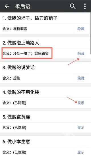 3、歇后语大全里除了收录歇后语,还包含每句歇后语对应的现实含义解析。