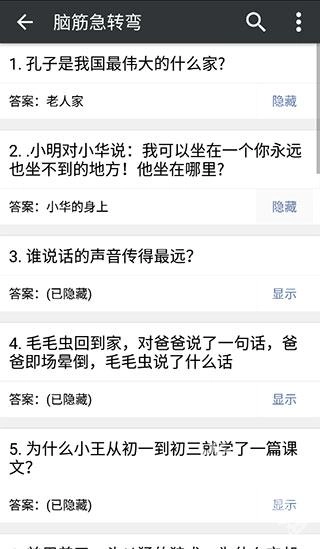 4、脑筋急转弯里附带答案,能和小伙伴一起猜,答案可隐藏或显示。