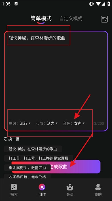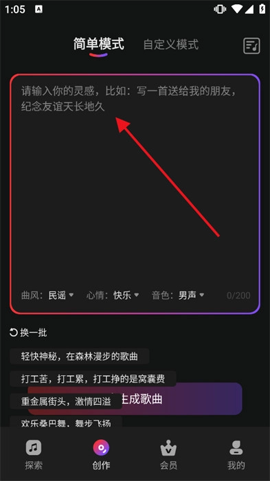 3、创作歌曲很简单,只需输入关键词和创作意向就行,并且支持二次编辑。