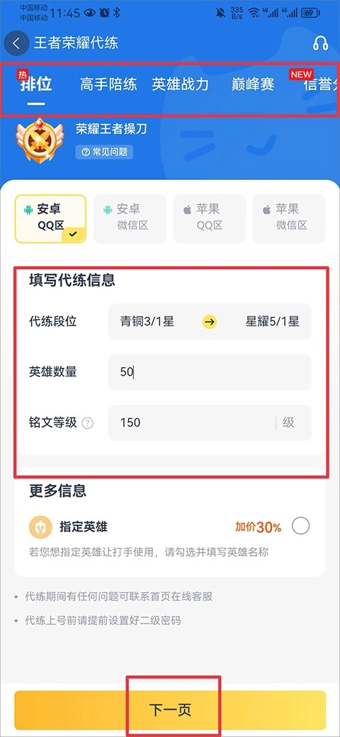 3、进入后你可以选择代练排位、高手陪练、巅峰赛、赏金联赛等服务,以排位赛为例,完善代练信息后点击下一步即可。