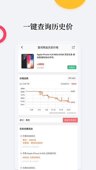 2、呈现商品历史价格走势,一键即可查询商品最低价格,获取优惠特价购买机会,并能识别虚假的打折促销活动。