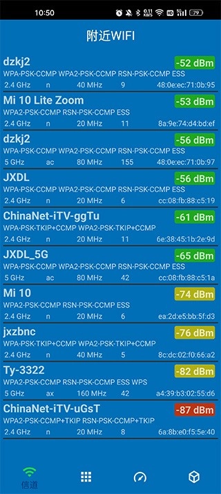 1、打开本站的软件,进入软件首页,在这个页面能够查看周边WiFi的信号强度;