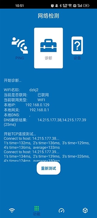 2、点击该功能后,选择“测试”选项,即可检测当前所连接网络的ping值与相关网络信息。