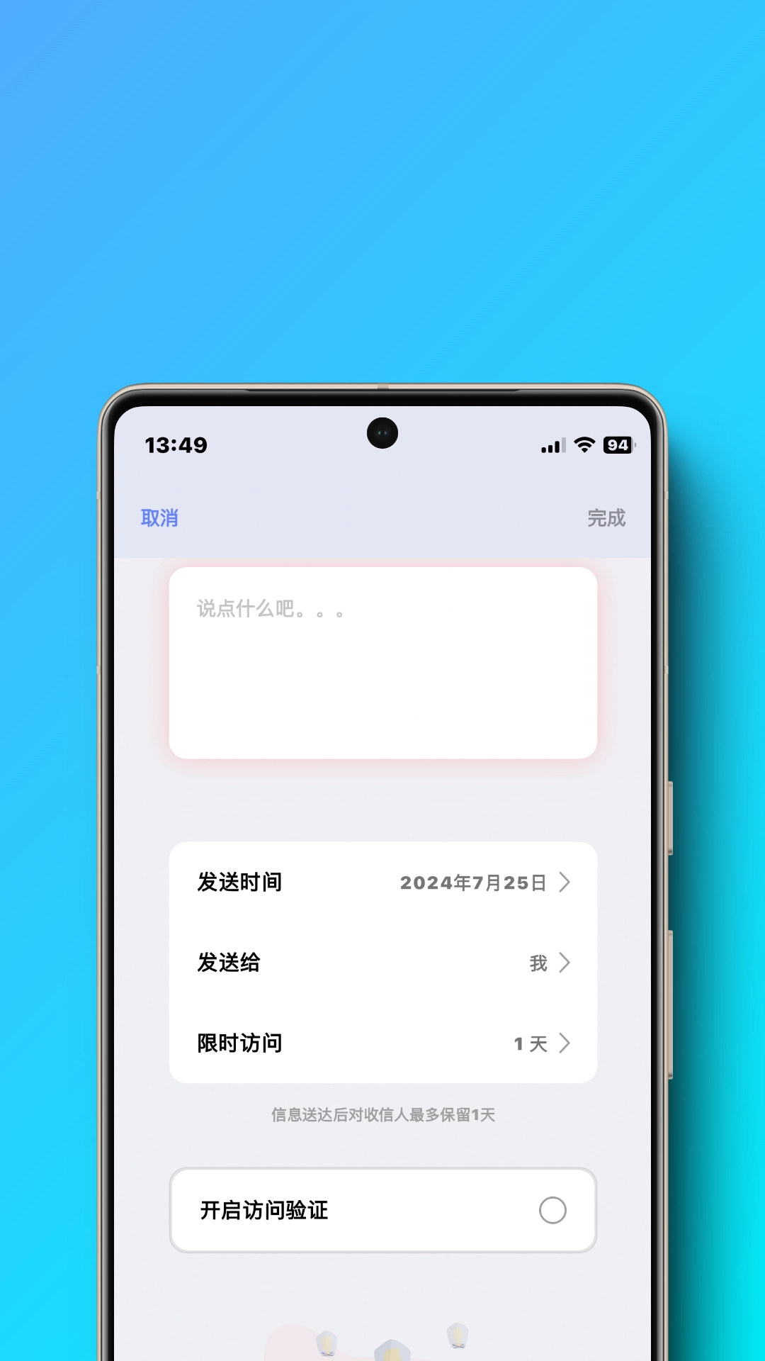 用户可以开启访问验证模式,之后在特定的某一天,通过输入验证就能访问时光信箱里的信件。