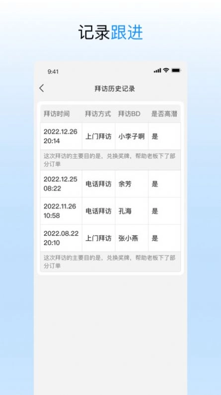 2. 打卡签到与上门拜访记录:能够对用户的打卡签到及上门拜访情况进行记录,助力用户对员工的工作状况进行管理,并跟进客户的进展情况。