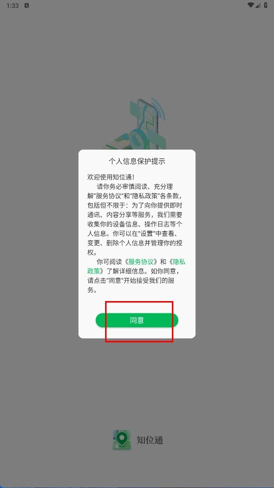 1、点击【同意】按钮,确认个人信息保护提示后,即可进入知位通应用。