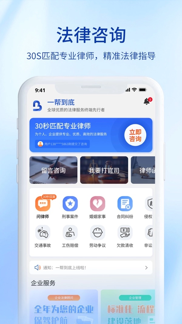 “一帮到底”是一款专注于法律咨询与服务的专业平台,致力于为用户提供高效且便捷的法律纠纷解决途径。平台整合了全国范围内的优质律师资源,能为用户提供律师精准匹配、在线即时咨询、案件进度实时追踪、法律文书专业代写等多项服务。案件处理流程全程透明,用户可随时查看进展,同时平台配备7×24小时全天候客服支持,全方位保障用户获得专业、可靠的法律援助。现在就选择“一帮到底”,体验高效便捷的法律服务吧。