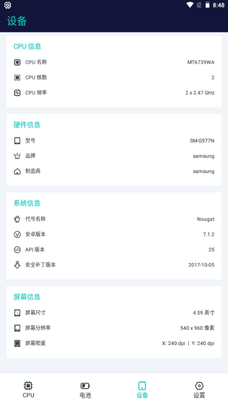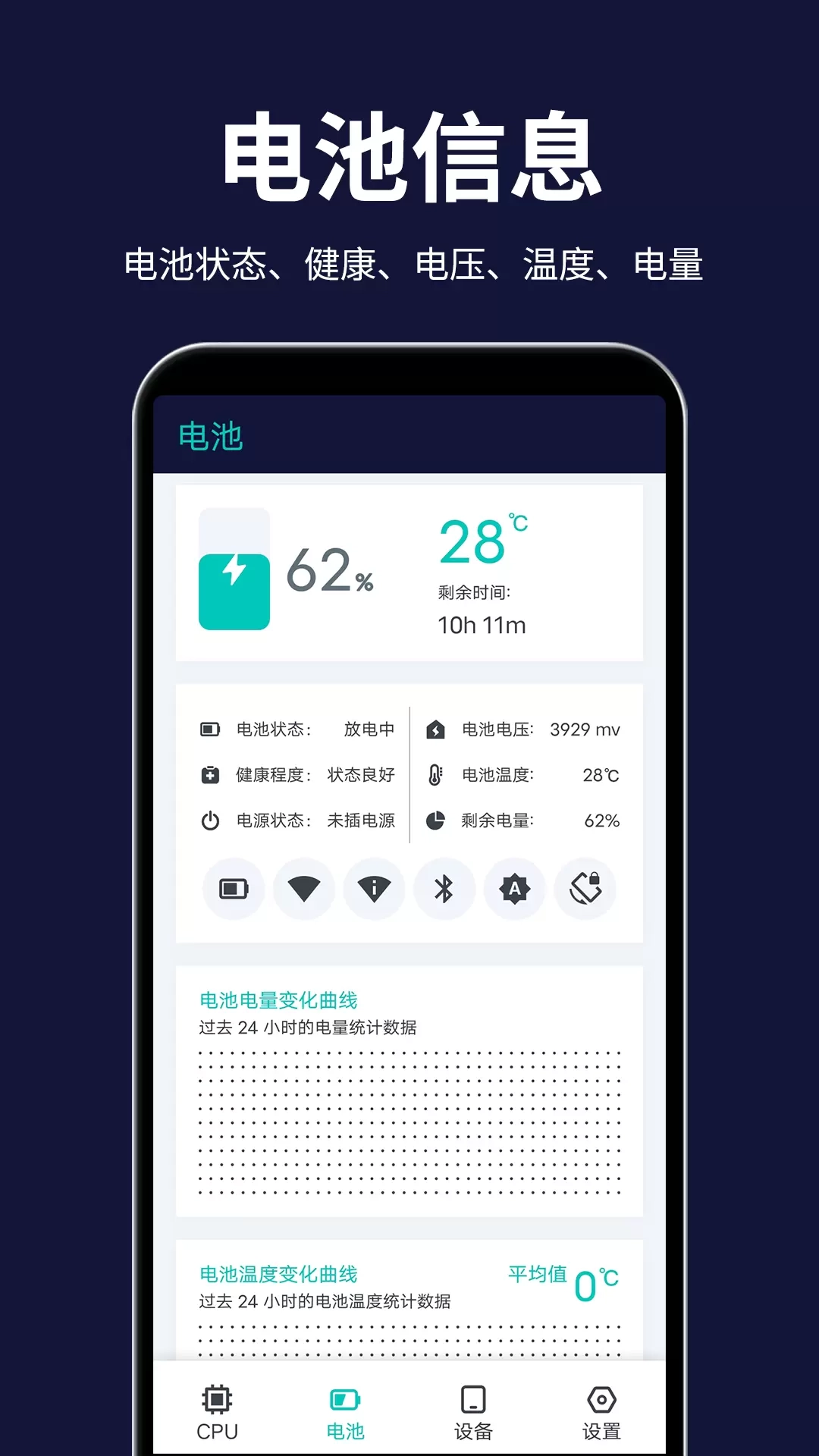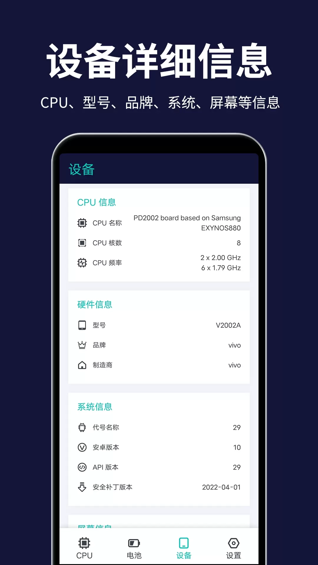 CPU设备信息是一款不可或缺的硬件检测工具,能让我们实时掌握设备的运行状态。它不仅会展示CPU的型号、核心数量以及使用率等信息,内容确实非常全面。要是我们正在给设备充电,还可以查看温度、电压等相关数据呢。