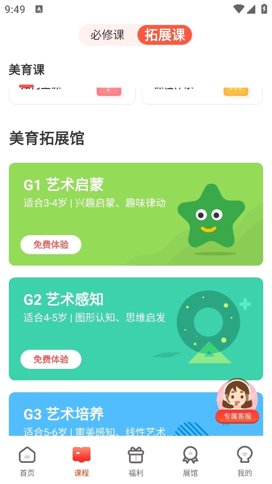 3、向下滑动找到美育拓展馆,依据学员自身实际情况挑选对应的级别,选定级别后可直接在该级别课程列表页面完成兑换操作。