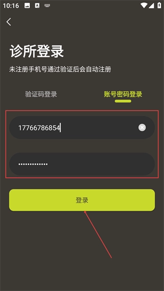 4、当选择【账号密码登录】方式时,输入对应的账号和密码,然后点击【登录】按钮,即可完成诊所账号的登录流程。