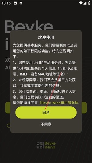 在使用【Beyke-iMind】之前,请先阅读权限说明以及《Beyke-iMind用户服务协议》,并点击【同意】按钮,以此来启动后续的操作流程。