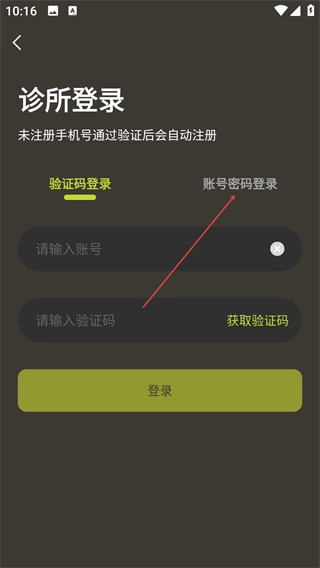 3、在【诊所登录】页面,可选择【验证码登录】或【账号密码登录】两种方式;若使用未注册的账号进行验证,系统将自动完成注册流程。