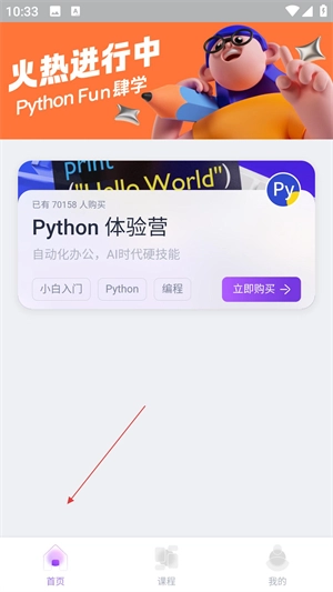 3、进入首页后,能看到Python体验营等课程的推广信息,用户可以了解课程详情并直接购买;页面底部设有首页、课程、我的三个功能导航栏。